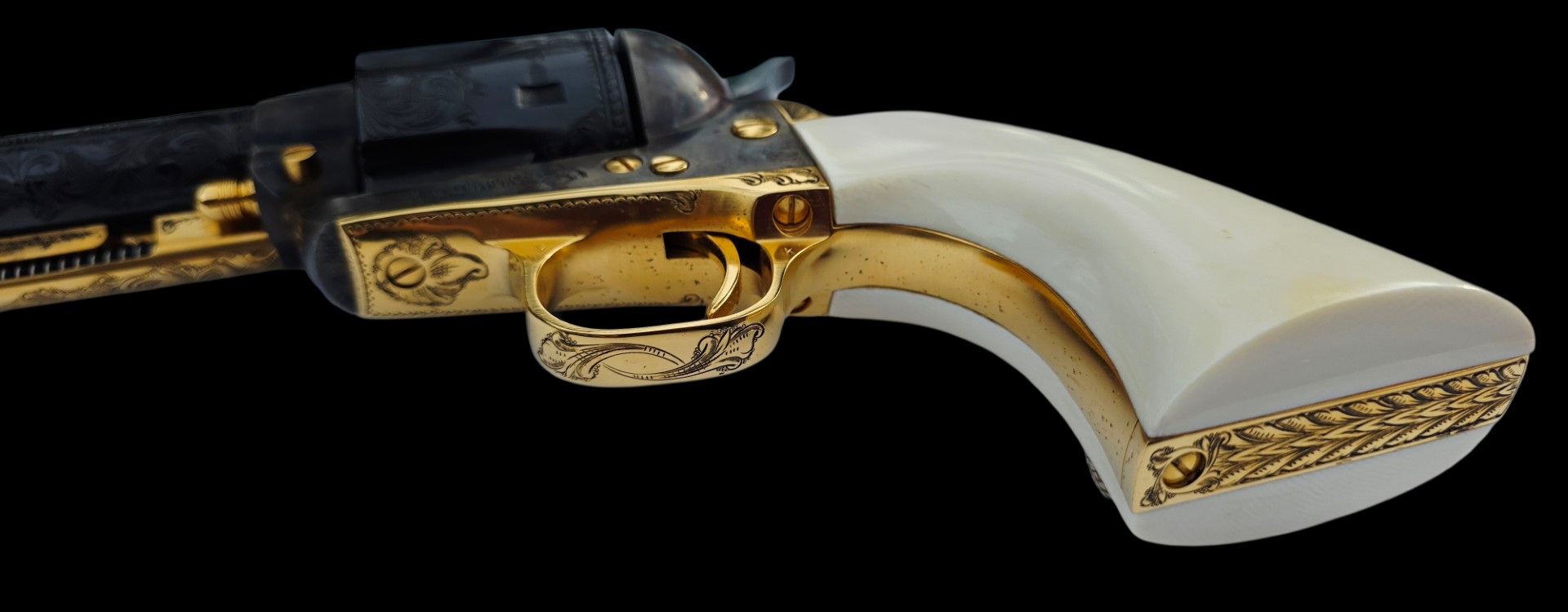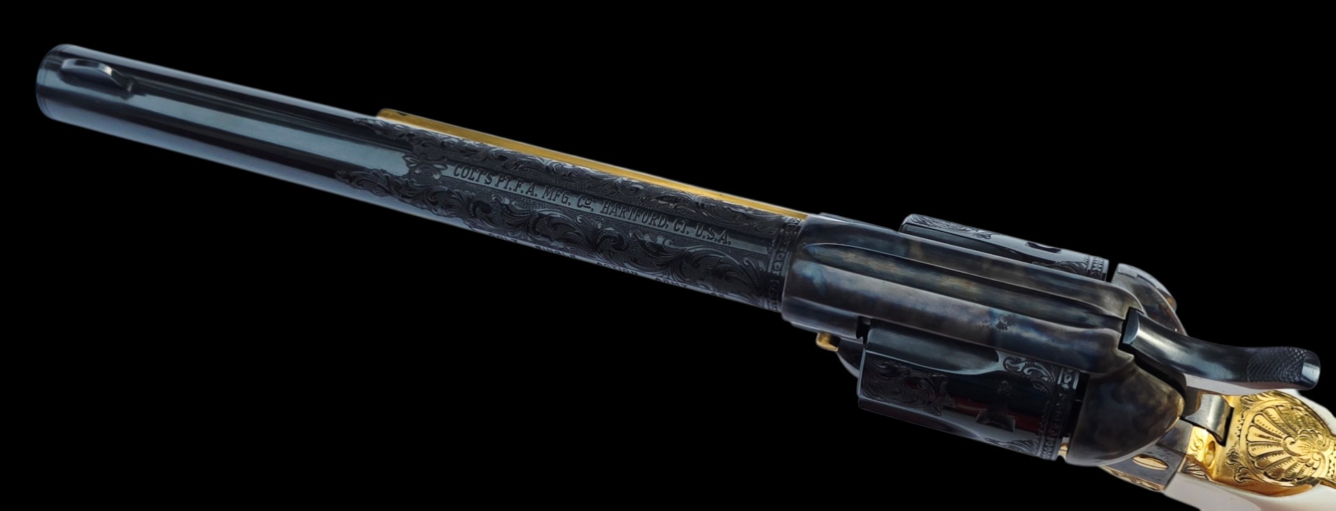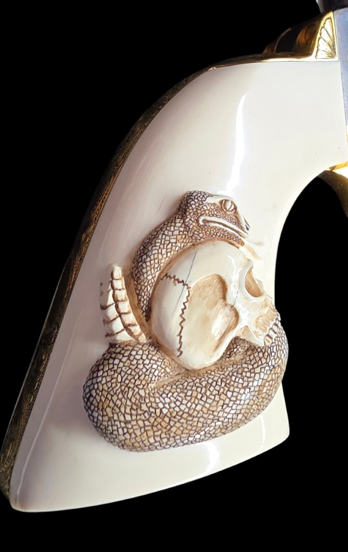 Gold plated, Blued and Case Colored Engraved Consecutive Serial Numbered Colt SAA 45 Colt Revolvers sporting Carved Ivory Skull Grips with skulls and snakes. A spectacular set of custom Colt revolvers in new condition, these are third generation pistols manufactured in 1981.