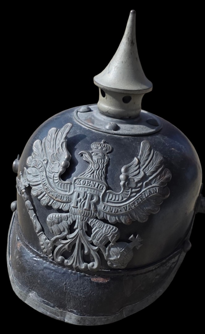 WW1 Prussian Enlisted Man’s Leather Spiked Helmet Pickelhaube, the liner dated 1915 and size stamped 56. Overall condition is very good with wear as shown and now minus its chin strap and cocades.