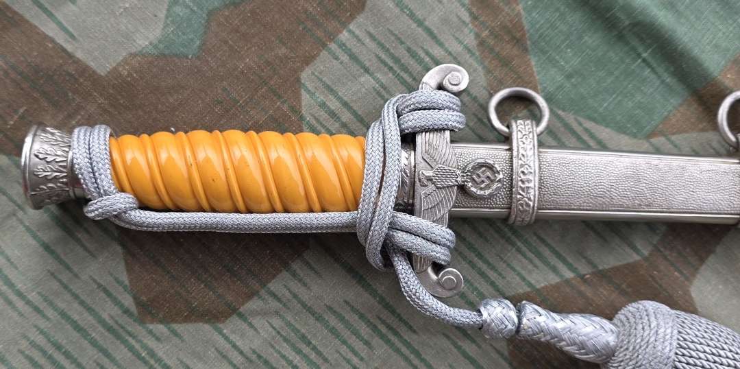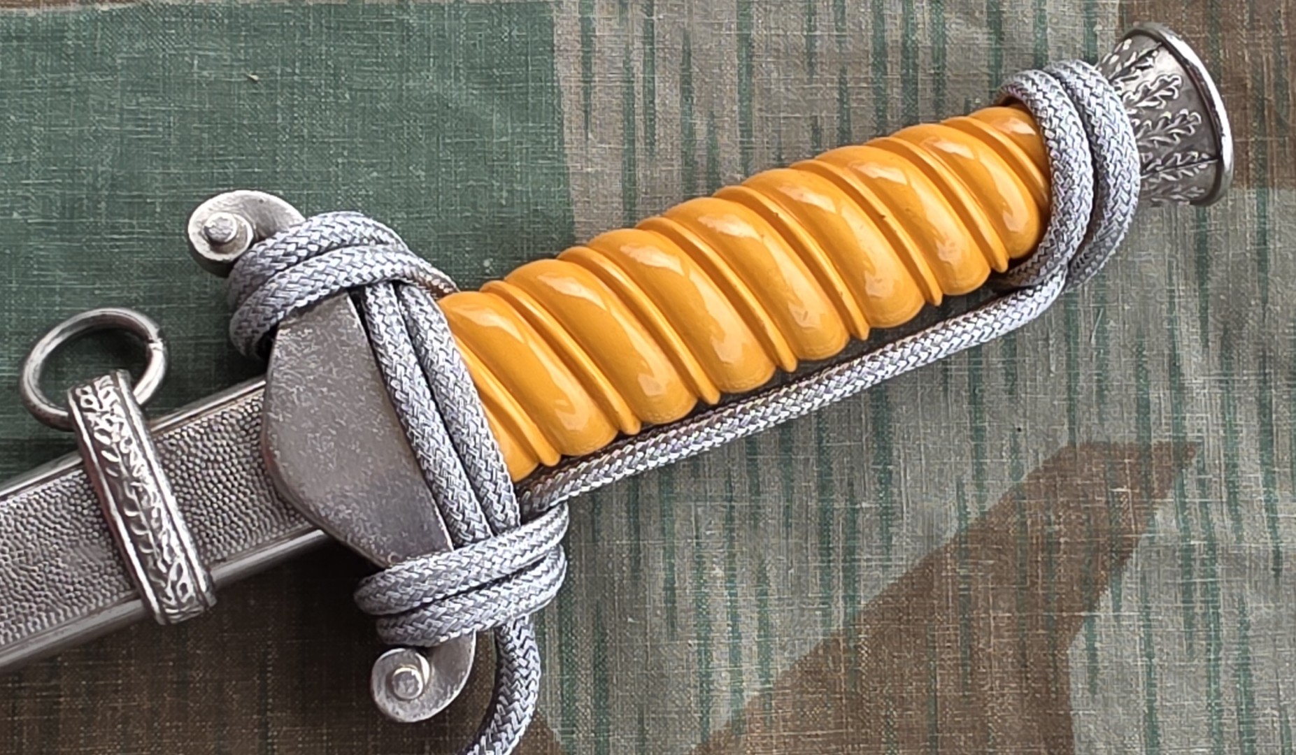 WWII German Army Officer’s Dagger Heeres-Offizierdolch by Gustav Spitzer in excellent condition overall with a yellow grip and silver portapee as illustrated. Ex Tom Wittmann collection