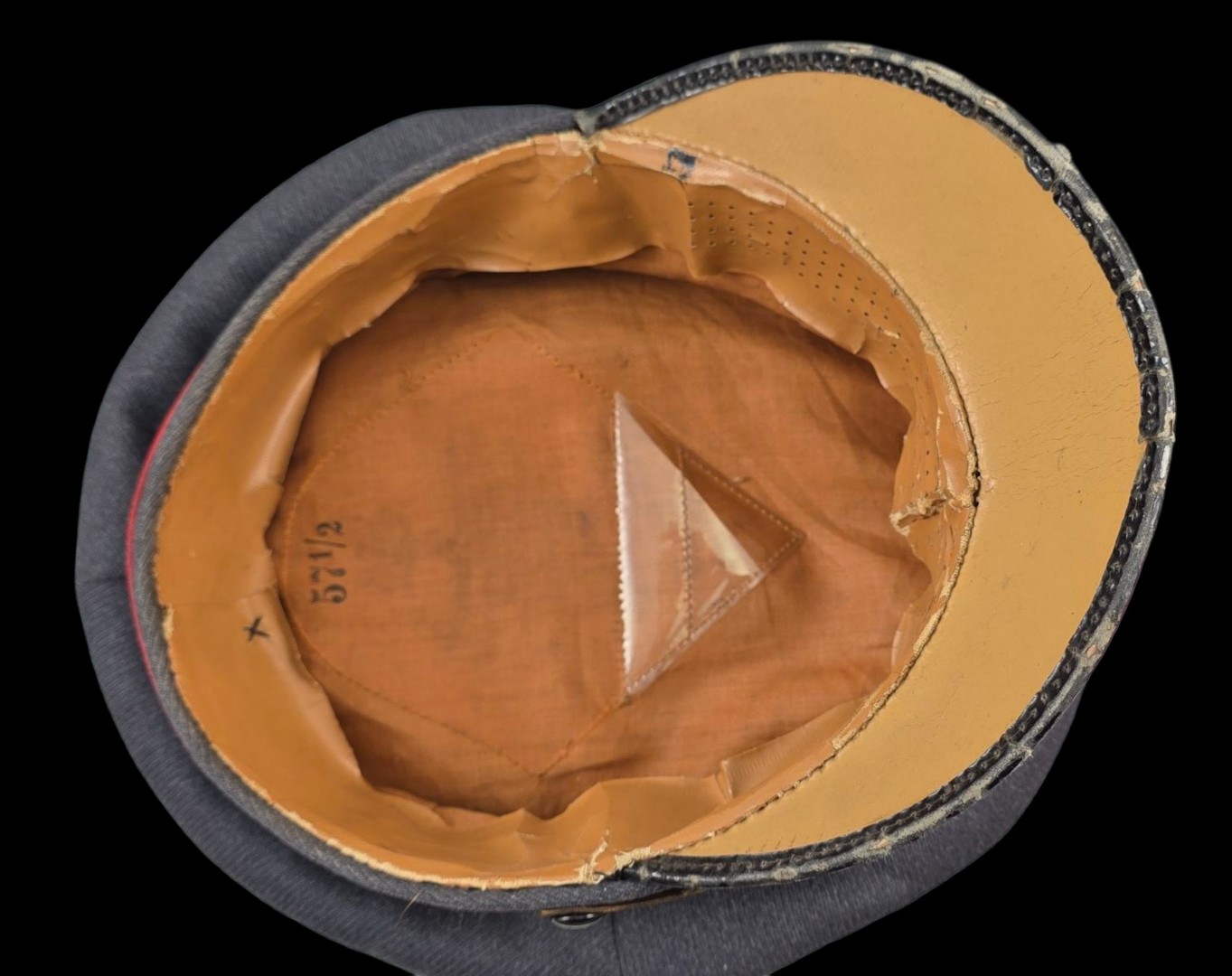 WWII German Luftwaffe Enlisted Man’s Artillery Visor Cap size 57 1/2 in very fine condition. Prewar style cap with oval chin strap keepers and droop tail eagle insignia.