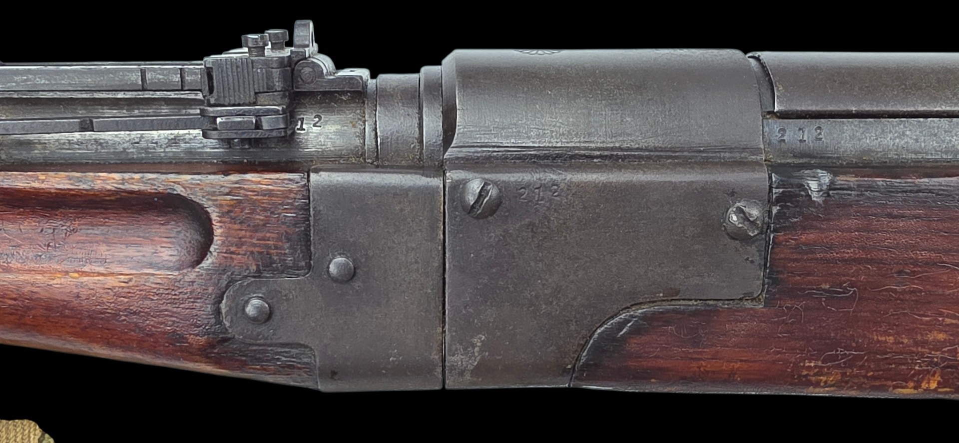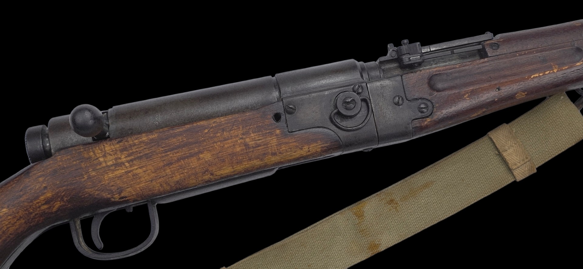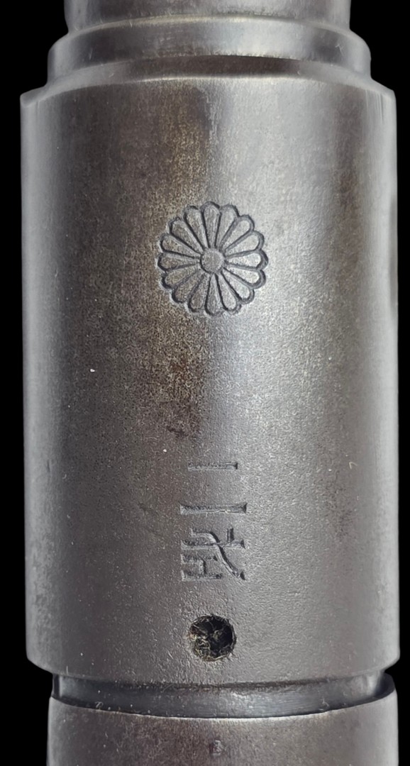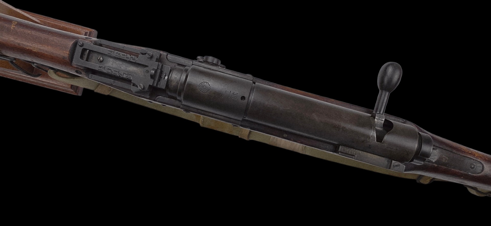 WWII Japanese Type 2 Paratrooper Rifle, complete with its Imperial Chrysanthemum intact and a sling that’s a field modification, featuring the soldier’s name written in ink. A rare Pacific War trophy weapon in overall very fine condition, showing the typical wear from combat use.
